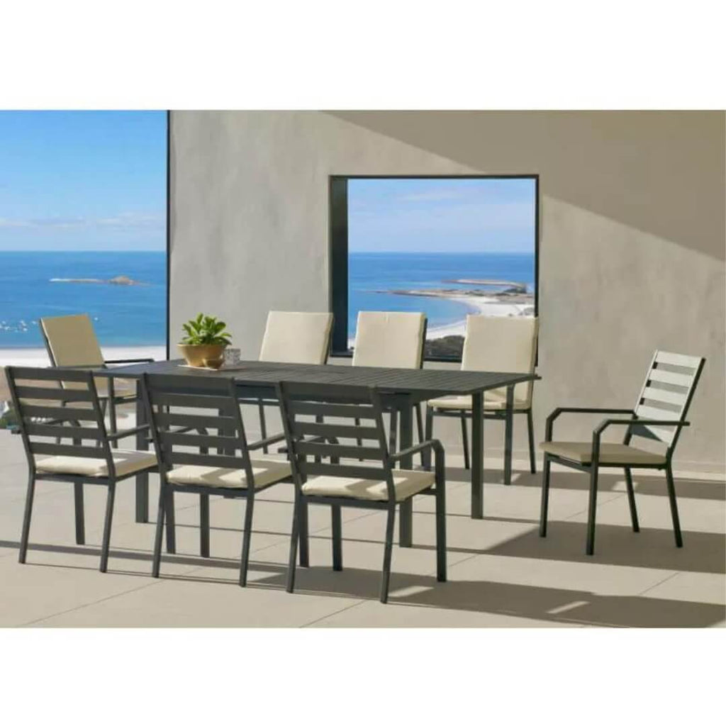 La structure de cet ensemble table et fauteuils de jardin est fabriquée dans un aluminium extrudé non recyclé, de très haute qualité.